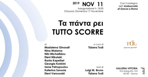 La Galleria Vittoria inaugura lunedì 11 Novembre alle ore 18,00 una mostra tutta al femminile, “Panta Rei” che vede coinvolte nove artiste di origine greca: Madalena Ginosati, Nina Malama, Niki Michailidou, Eleni Nikolaki, Rania Kapeliari, Georgia Kokkini, Irene Petropoulou, Katerina Soroula, Eleni Varouxaki.