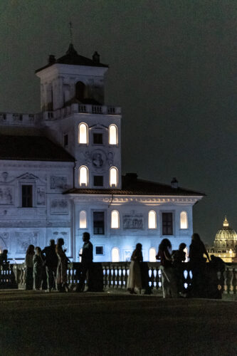 Il 4 novembre scorso è tornata, a distanza di due anni (la pandemia non ha comunque bloccato l’attività negli atelier della Villa), la Notte Bianca dell’Accademia, un’iniziativa che ha il valore di un primo incontro tra la città di Roma e i borsisti che resteranno in residenza fino all’estate 2022. Il curatore dell’evento, Saverio Verini ha curato l’edizione ‘Presto, la notte’ – un incoraggiamento alla notte perché si manifesti in fretta, con il suo carico di suggestioni – coordinando la partecipazione dei sedici borsisti ospiti dell’Accademia: artisti visivi, storici dell’arte, compositori, scrittori, architetti, designer, videomaker. Ognuno di loro ha collocato il proprio intervento negli spazi della Villa, cocome ‘biglietto da visita’ che precede la creazione di lavori ispirati dal soggiorno nella Capitale. Dunque, tradotto: il pubblico numerosissimo, ha potuto seguire un percorso tra opere d’arte visiva, performance, videoproiezioni, installazioni, interventi sonori, conferenze, tra giardino e edificio principale, e ambienti di solito inaccessibili.