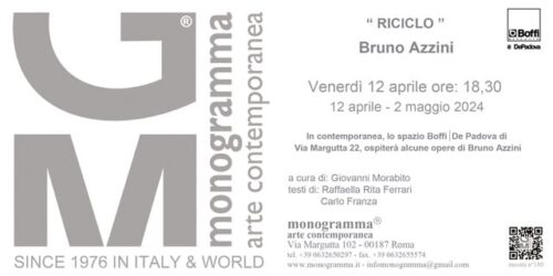 Appuntamento nel weekend alla galleria Monogramma in via Margutta a Roma. In calendario la mostra “Riciclo” di Bruno Azzini per venerdì 12 aprile alle ore 18:30. In contemporanea lo spazio Boffi-De Padova in via Margutta 22 ospiterà alcune opere di Azzini.