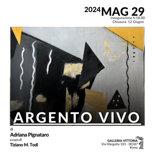 La personale dell’artista Adriana Pignataro dal titolo “Argento Vivo“, curata da Tiziano M. Todi, dal prossimo 29 maggio al 12 giugno 2024 , avrà luogo presso la Galleria Vittoria, in Via Margutta 103 a Roma.