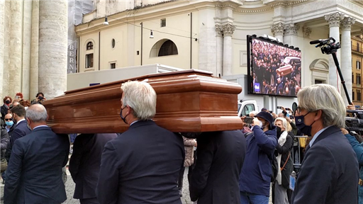 A seguire la cerimonia, celebrata da Don Walter Insero e trasmessa in diretta su Rai1, si sono unite all’esterno centinaia di persone che hanno potuto seguire le esequie attraverso un maxischermo. L”ondata costante di affetto per l’icona del cinema, e’ partita dal lungo applauso con cui la folla ha accolto l’ingresso in piazza del carro funebre con il feretro (che verra’ tumulato al Verano), scortata da agenti in moto della Polizia Municipale.