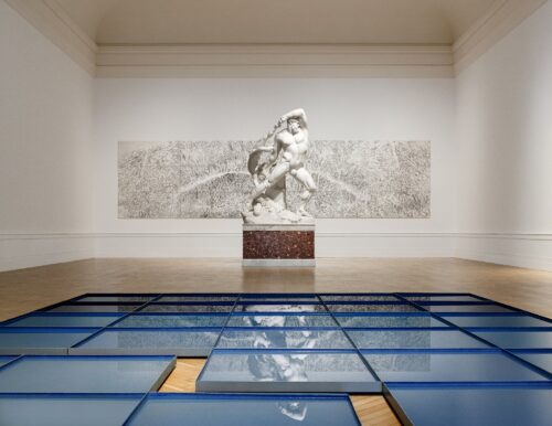 Ma quella raccontata è anche una storia fatta di luoghi, spazi museali, vicissitudini talvolta complesse che hanno accompagnato la galleria nel corso del Novecento. Si va così dall’inaugurazione nel 1925 a Palazzo Caffarelli e la riapertura nel 1931 con il nome di Galleria Mussolini, curata da Antonio Muñoz, alla prima Quadriennale nel 1931 al Palazzo delle Esposizioni; dalla rinascita a Palazzo Braschi nel 1952 alla nuova sede al Palazzo delle Esposizioni (dal 1963 al 1972) a cura di Carlo Pietrangeli. Fino ad arrivare alla doppia inaugurazione del 1995 e del 2011 nella sede attuale, all’interno dell’ex convento delle carmelitane scalze a San Giuseppe a Capo le Case. Riconducibile alla fase iniziale di costruzione del convento, è il dipinto murale seicentesco realizzato da Suor Eufrasia della Croce, abitante del convento e amica di Plautilla Bricci, scoperto dopo anni di occultamento su una delle pareti del primo piano e tornato visibile, oggi, in occasione dell’apertura della mostra. I dipinti erano destinati alla decorazione di uno degli ambienti più sacri della clausura, il coro d’inverno, dove si custodiva una reliquia della vera croce. Dai frammenti rimasti si percepisce una decorazione più estesa: due suore in preghiera davanti alla Croce-fontana, simbolo di vita e resurrezione, legata alla spiritualità carmelitana. Accanto, un secondo murale con la Vergine, Maria Maddalena e San Giovanni, oggi lacunoso al centro, mostra un registro più drammatico rispetto al primo.