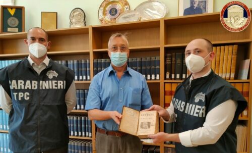 I carabinieri per la Tutela del patrimonio culturale restituiscono alla Curia generalizia dell’Ordine dei Gesuiti di Roma un volume del XVII secolo. Il volume del Seicento in lingua francese dal titolo “Les lettres de S. Jerome”, ristampa del 1682 degli scritti di carattere dottrinale-religioso di San Girolamo, è stato consegnato a Padre Raul Pablo Gonzalez Bernardi, Direttore della Biblioteca “Peter – Hans Kolvenbach” della Curia Generalizia dell’Ordine dei Gesuiti di Roma, dai carabinieri del nucleo per la Tutela del patrimonio culturale (Tpc) di Udine, al comando del maggiore Lorenzo Pella. La seicentina è stata riconsegnata al termine di un’indagine coordinata dalla procura della Repubblica di Gorizia e intrapresa a seguito del monitoraggio dei canali di e-commerce finalizzato alla ricerca di libri antichi illecitamente commercializzati. Il volume era stato infatti posto in vendita su una piattaforma commerciale telematica da un privato residente nel capoluogo isontino, destando immediatamente l’interesse dei Carabinieri per la presenza dei segni distintivi in lingua latina e francese riconducibili all’Ordine dei Gesuiti della Provincia d’Europa Occidentale francofona.