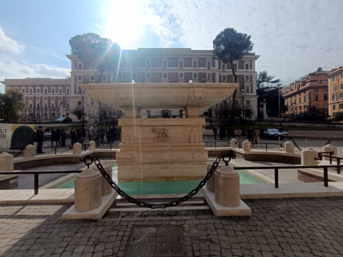 “È una delle 55 fontane del programma Caput mundi, un’opera straordinaria che ha una forma particolare. Adesso continuerà a svolgere la sua funzione decorativa, ringrazio la sovrintendenza capitolina che ha curato questo intervento”, ha concluso Gualtieri. La fontana, inizialmente progettata dallo scultore Publio Morbiducci per una piazza del quartiere Testaccio, è stata realizzata tra il 1929 e il 1931 ed installata in piazza del Viminale. L’opera, in travertino, è composta da un grande bacino mistilineo posto ad una quota ribassata rispetto al selciato della piazza al centro del quale si innalza un massiccio basamento rettangolare realizzato con blocchi squadrati giustapposti e formanti un insieme compatto di forma parallelepipeda decorato con rilievi raffiguranti la Lupa Capitolina, le tre alture dello stemma del Rione Monti e la corona turrita simbolo della città. Nel 1999 la fontana è stata restaurata e l’intervento ha previsto il restauro delle superfici e il risanamento strutturale ed architettonico della vasca superiore che presentava due fratture profonde. Nel 2018, a causa della riapertura delle stesse lesioni, di cui una passante, la fontana è stata messa in sicurezza con l’introduzione di un sistema di funi in acciaio inox per contrastare il movimento di ribaltamento ed evitare la caduta delle porzioni a sbalzo all’ estremità della vasca superiore la cui stabilità risultava oramai compromessa.