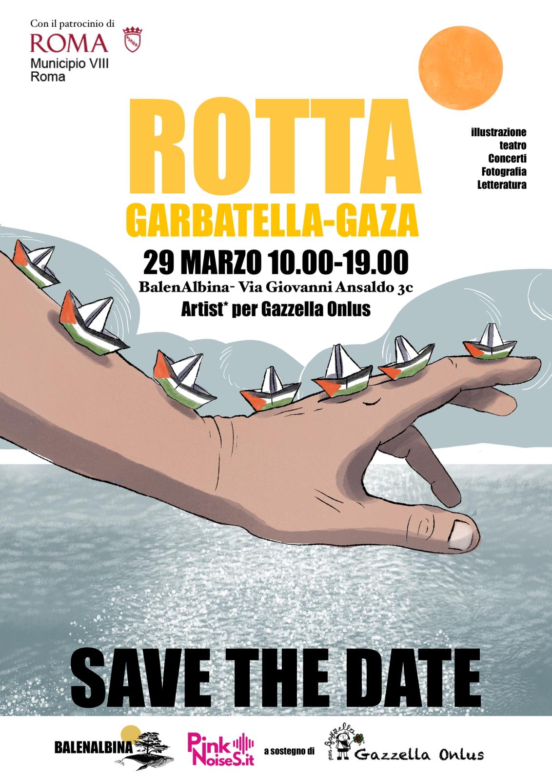 C’è un filo invisibile che domenica 29 marzo collegherà un quartiere di Roma alla Striscia di Gaza. Si chiama “Rotta Garbatella-Gaza” ed è una giornata di arte, musica e cultura organizzata da Balenalbina e dalla webzine culturale Pinknoises.it con il patrocinio del Municipio VIII, aperta a tutti dalle 10 alle 19 in via Giovanni Ansaldo 3C.
