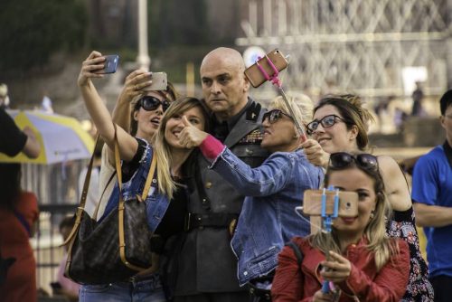 Mussolini "assalito" da selfie stick in una scena di Sono tornato, il film che ipotizza il suo ritorno dal 1° febbraio al cinema