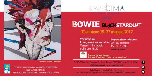 Seconda edizione per Bowie BlackStardust, il più importante evento celebrativo dedicato al Duca Bianco. Come per l’edizione 2016, si terrà a Roma, dal 19 al 27 maggio, dalle ore 15:30 alle ore 19:30, presso la galleria SpazioCima, in via Ombrone 9. Ingresso libero.
