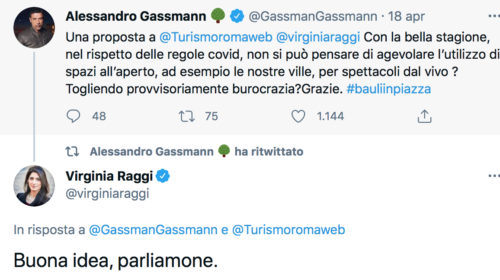“Una proposta a Turismo Roma Web. Con la bella stagione, nel rispetto delle regole Covid, non si può pensare di agevolare l’utilizzo di spazi all’aperto, ad esempio le nostre ville, per spettacoli dal vivo, togliendo provvisoriamente burocrazia? Grazie”. Lo scrive su Twitter Alessandro Gassmann taggando la sindaca di Roma Virginia Raggi che, gli risponde: “Buona idea, parliamone”.