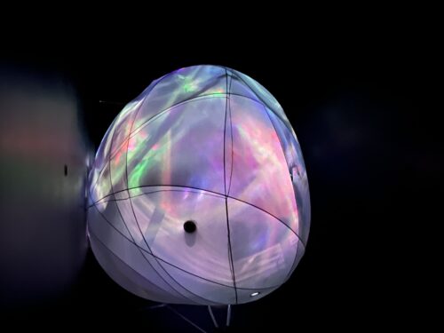 Il visitatore interagisce con l’opera sbirciando all’interno attraverso dei fori dotati di sensori che riproducono l’immagine dell’occhio sulla superficie della sfera e in streaming live all’esterno della struttura.