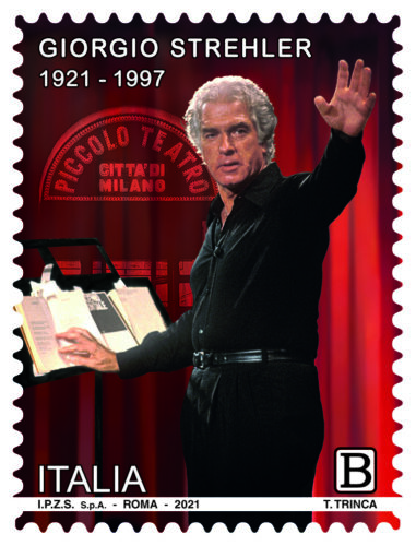 I cento anni dalla nascita del regista Giorgio Strehler (avvenuta a Trieste il 14 agosto del 1921) sono stati ricordati oggi con l’emissione di un francobollo valido per la posta ordinaria. La vignetta del valore postale mostra un ritratto di Giorgio Strehler impegnato a impartire indicazioni di regia; sullo sfondo spicca un’insegna luminosa con denominazione del Piccolo Teatro di Milano.