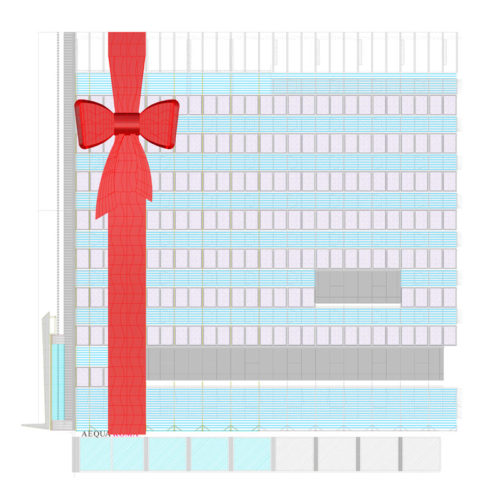 Grande l’impatto visivo delle installazioni: concepiti come enormi decori natalizi, i due fiocchi sono infatti dotati d’illuminazione interna in modo da essere visibili anche la notte e sono posti sulle facciate degli edifici. Per quanto riguarda le torri Lafuente, l’installazione si arricchisce anche di un grande rocchetto di nastro rosso con un paio di forbici, come se un gigante le avesse lasciate lì con l’intenzione di tornare a finire la decorazione