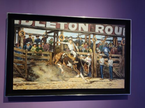 Ma la parte della mostra a nostro avviso più suggestiva è quella denominata dalla curatrice Deep Focus. Una carrellata di dipinti – che impropriamente potremmo definire ‘folk’ – dove sono rappresentati un rodeo, scene di vita quotidiana, un bar, incontri pugilistici e tanto altro. La tecnica utilizzata ha previsto l’utilizzo molto cinematografico del primo piano, secondo piano e sfondo. Il risultato è una suggestiva sequenza di quadri che parlano o, per meglio dire, cantano al pubblico presente: