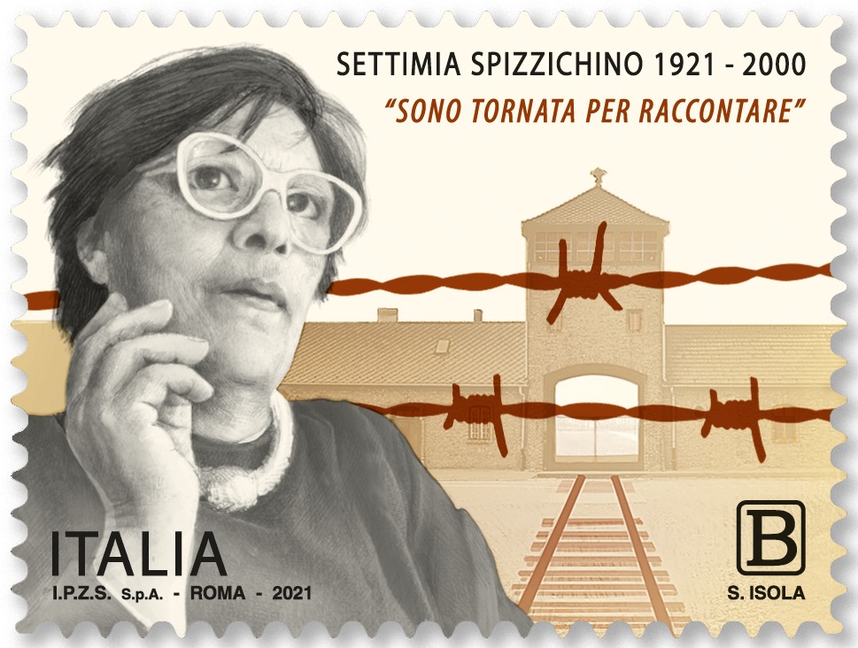 Sullo sfondo del filo spinato e del lager di Auschwitz-Birkenau, compare un ritratto di Settimia Spizzichino, unica donna sopravvissuta alla deportazione del Ghetto di Roma del 16 ottobre 1943, affiancato alla sua frase: “sono tornata per raccontare”. Si presenta così il francobollo emesso oggi nel centenario della nascita di Settimia Spizzichino e valido per la posta ordinaria.