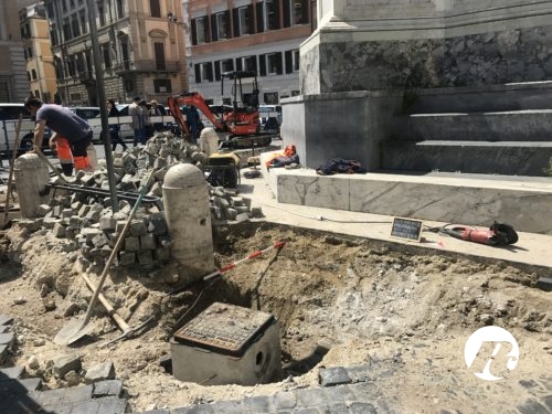 La monumentale colonna dedicata al dogma dell’Immacolata Concezione, (alla quale ogni 8 dicembre il Papa rende omaggio) è, ora, ampiamente transennata, camion e scavatori vanno e vengono. Rimuovono i sanpietrini e scavano un’ampia trincea.