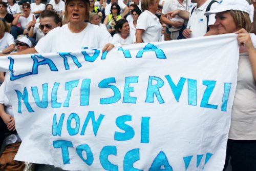 Vittorio Pezzotti della Cgil Filcam Roma e Lazio, spiega: “Siamo qui perché da quasi un anno ormai discutiamo con questa amministrazione senza arrivare ad una situazione occupazionale per questi lavoratori. Questi vengono da un lungo percorso, di lavori Lpu Lsu anni ‘90, poi hanno vissuto dentro un’azienda a capitale misto, adesso questa società non può più gestire questa cosa, al comune abbiamo chiesto di istituire una società completamente a capitale pubblico e si può fare. Hanno scelto invece di fare la doppio oggetto che significa ricostituire di nuovo una società a capitale misto e questo per noi può comportare dei problemi perché porta alla suddivisione in lotti del lavoro, può creare problemi occupazionali, inoltre costa di più al comune perché se si facesse una società in-house non ci sarebbe margine per il privato e puoi costruire anche un percorso di formazione mirato ad ottimizzare il servizio. Qui facciamo servizio a bambini da 0 ai 14 anni. Non ci hanno voluto sentire e quindi siamo qui a manifestare. In più – prosegue – abbiamo questa società mista dove il capitale è a maggioranza pubblica, cioè del comune attraverso Ama, che continua a fare atti di scorrettezza profonda, ovvero due procedure di mobilità e non dovrebbero esserci. La seconda scorrettezza riguarda 30 impiegati. C’è la Legge Madia che prevede un percorso e cioè entro settembre dovevano fare la ricognizione, ed è stata fatta. Da settembre a dicembre dovevano essere aperti i tavoli per capire quanti eventuali esuberi aveva ogni azienda e poi capire come venivano ricollocati. Purtroppo – continua Pezzotti – i tavoli non sono partiti. Oggi incontriamo tre assessori, Pinuccia Montanari, Laura Baldassarre e quello nuovo delle partecipate, Alessandro Gennaro. Io ho paura che non risolviamo granché perché le notizie che ci arrivano dal direttore generale sono quelle che le scelte assunte da questa amministrazione non vengono rimesse in discussione. Quindi oggi i lavoratori della Multiservizi sono in sciopero che soltanto per le scuole sono 2.600, poi ci sono quelli dell’Atac che sono circa 600 persone. Un manicomio vero”, conclude.