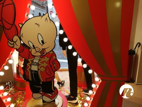 Così, i brand più importanti, si sono inventati 1000 capi, oggetti, accessori tutti rigorosamente dedicati al simbolo di questa lunghissima festa. Da quello che ci hanno riferito alcune “firme” i capi personalizzati stanno avendo un ottimo riscontro, anche se è inutile dirlo, trattandosi di grandi marchi i prezzi non sono proprio irrisori… Fra le tante vetrine dedicate al maialino quella che ci è piaciuta di più è quella di Moschino, così colorata, allegra e “animata”.