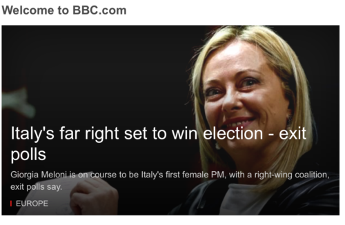 “L’estrema destra vince le elezioni italiane e Giorgia Meloni è in procinto di diventare la prima donna premier”, titola la Bbc in apertura. “Il partito post-fascista di Giorgia Meloni in testa”, è il bulletin dell’agenzia France Presse.
