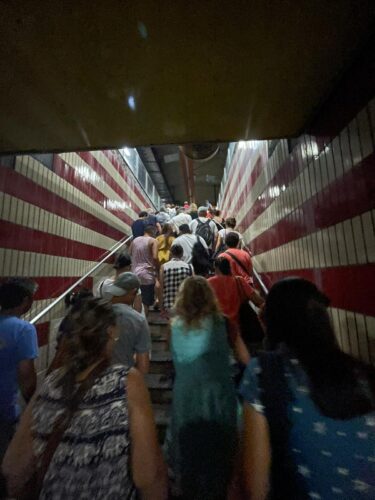 I pendolari mentre escono dalla stazione della Metro A Baldo degli Ubaldi dove i vagoni sono rimasti bloccati a causa di un guasto alla rete elettrica.