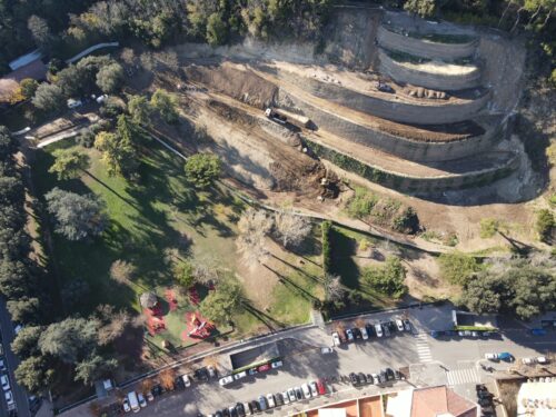 L’intervento, realizzato con la tecnica delle terre rinforzate, ha consolidato il pendio tra il parco “Giovanni Paolo I” e Villa Veschi, sistemando acque meteoriche e aree verdi.