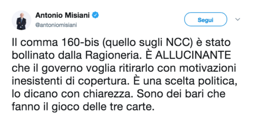 Ennesimo colpo di scena nella querelle che vede coinvolto governo, tassisti ed NCC. Come spiegato oggi dal sottosegretario dell’Economia Massimo Garavaglia in Commissione Bilancio, lo stralcio del comma sugli NCC è avvenuto per ragioni di copertura.