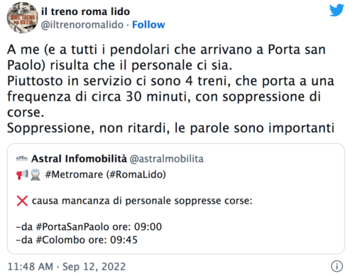 La Roma-Lido infatti – per anni peggiore ferrovia italiana secondo il rapporto Pendolaria di Legambiente – sta vivendo dei giorni complessi a causa di difficoltà che pendolari e blogger attribuiscono alla penuria di treni in circolazione. Molte notizie sullo stato delle ferrovie ex-concesse di Roma – Roma-Lido, Roma-Giardinetti e Roma-Civita Castellana-Viterbo – giungono spesso da utenti che prendono quotidianamente il treno segnalando guasti e criticità. L’altro ieri “Il treno Roma-Lido”, utente e blogger di Twitter, ha segnalato problematiche divergenti rispetto a quelle riportate da Astral Infomobilità per motivare la soppressione di corse. Non assenza di personale ma, dice, di treni: