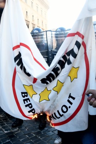 A presidiare la manifestazione, oltre a polizia e carabinieri in assetto antisommossa, anche una quindicina di agenti del I Gruppo della Polizia locale di Roma capitale. Intorno a mezzogiorno dal palco dei manifestanti è partita un’accusa infondata nei confronti dei vigili presenti sulla piazza impegnati nelle deviazioni del traffico. I vigili sono stati accusati di stare lì per multare una decina di loro auto al momento presenti su un lato della piazza in divieto di fermata. Si è scatenata subito una “caccia” al vigile, individuato come quello più vicino alle loro auto, che è stato accerchiato da una trentina di manifestanti rischiando il linciaggio. A salvarlo le forze dell’ordine, che hanno sottratto fisicamente l’agente accerchiato portandolo al riparo all’interno di un furgone cellulare. Poi la rabbia dei manifestanti si è rivolta verso un tassista in transito la cui auto è stata danneggiata con calci e pugni, mentre venivano fatte esplodere due bombe carta.