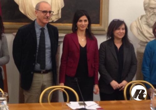 Al centro la sindaca Raggi, alla sua destra l'assessora alle politiche abitative Rosalba Castiglione mentre alla sua sinistra l'assessore all'Urbanistica, Luca Montuori