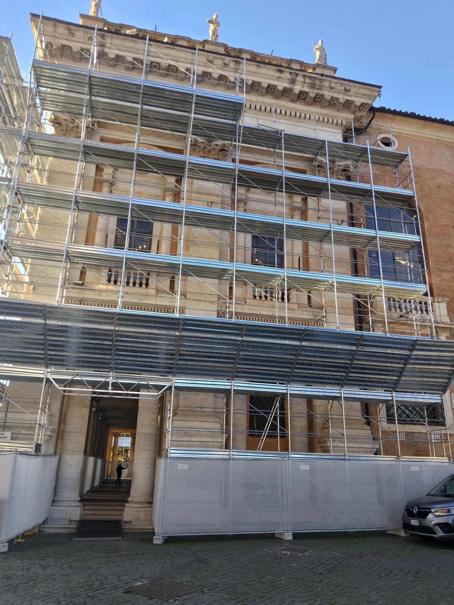Sono partiti i cantieri per il restauro delle facciate dei Musei Capitolini. Da alcuni giorni in piazza del Campidoglio gli operai hanno iniziato a tirare su le impalcature che al momento foderano tutto il lato del palazzo prospiciente alle scale dell’Arce Capitolina. La cantierizzazione è stata avviata anche sul lato di fronte, dal quale si accede alla visita ai musei dalla piazza. Il cantiere è svolto con 3,5 milioni di fondi del capitolo giubilare Caput Mundi e avrà termine nel secondo trimestre del 2025. È previsto il restauro e la manutenzione dei prospetti dei tre edifici capitolini, focalizzati sulla parte michelangiolesca – spiegano dalla Sovrintendenza capitolina che ha in carico il progetto -, è previsto inoltre il restauro e la manutenzione della pavimentazione di piazza del Campidoglio; l’impermeabilizzazione (parziale o totale) delle falde dei tetti dei tre edifici capitolini, che convergono sulla piazza; la manutenzione e l’adeguamento del sistema di raccolta e deflusso delle acque meteoriche dei tre edifici capitolini; l’installazione di un nuovo sistema di raccolta e conferimento delle acque meteoriche provenienti dai tre edifici e da piazza del Campidoglio; rimozione della vecchia rete elettrica e sostituzione con una nuova rete per l’illuminazione pubblica monumentale; sostituzione dei vecchi corpi illuminanti con nuovi apparecchi a Led di ultima generazione per gli edifici Capitolini; il consolidamento strutturale dei tre edifici capitolini; il restauro delle decorazioni architettoniche e degli elementi scultorei presenti sui prospetti dei tre edifici; il ripristino delle finestre e delle persiane originali dei tre edifici, utilizzando materiali tradizionali e soluzioni tecniche moderne per garantire l’efficienza energetica.