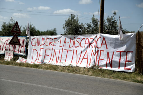 Uno striscione ai cancelli della discarica ad Albano Laziale (2 agosto 2021)