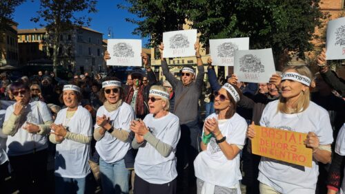 Cartelli, fischietti, magliette e striscioni per protestare contro i dehors e il degrado nel centro città a Roma. Ha preso il via la manifestazione organizzata dalla “Rete di associazioni per una città vivibile” a piazza Mastai, nel quartiere Trastevere. Al centro della protesta la proroga al 2024 del regime semplificato per l’occupazione di suolo pubblico (Osp) da parte delle attività che somministrano cibo e bevande, come bar e ristoranti. Nella piazza della Capitale alcuni manifestanti hanno alzato le braccia e le hanno incrociate. Sulla testa una fascia di carta: “Basta con i dehors, l’emergenza è finita”. Lo stesso messaggio è stato cantato in coro.