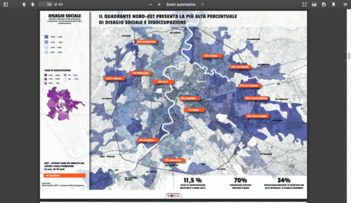A Roma, ben il 70 per cento degli abitanti vive nelle periferie, ed il 34 per cento vive in aree di alto disagio economico e sociale; il tasso complessivo di disoccupazione è dell’11,5 per cento, distribuito non uniformemente in città: le zone a colorazione viola sono infatti quella con un più altro tasso di disoccupazione e nelle aree dove il viola è più scuro, la disoccupazione è superiore a quella media, andando dall’11,5% al 36%.