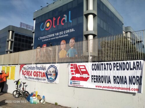 “Quale cura del ferro?”. Oppure: “Cotral, la pazienza è finita”, ma anche invettive più dure come “Dieci anni di bugie. Buffoni!”. Sono alcuni degli striscioni apparsi ieri sotto la sede di Cotral nel sit-in organizzato dai pendolari di Roma-Viterbo e Roma-Lido.