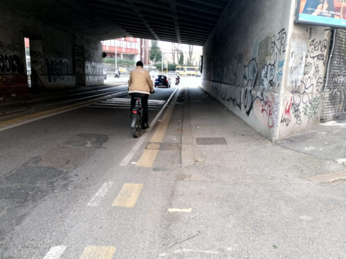 La pista ciclabile in via prenestina che sotto al ponte ferroviartio diventa di 30 centimetri.