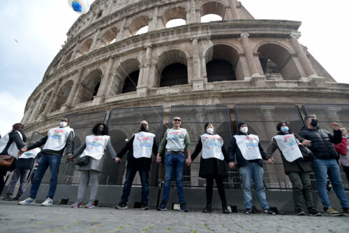 Una catena umana, composta da un migliaio di lavoratori del comparto del turismo, ha circondato il Colosseo a Roma per il flash mob di protesta contro la crisi economica, causata dal Covid, che ha investito il settore. Alla protesta, organizzata dai sindacati Filcams Cgil, Fisascat Cisl e Uiltucs, sta partecipando anche il leader nazionale della Cgil, Maurizio Landini.