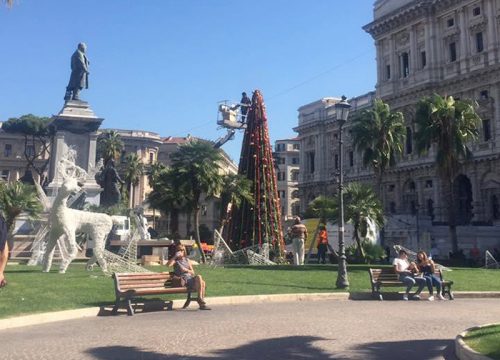 L’albero ha trovato una collocazione nell’aiuola principale, in mezzo alle palme che di sicuro sembrano più adatte ai 24 gradi che al momento abbracciano Roma e al solleone che da giorni regna sulla Città Eterna. Temperature da inizio giugno, insomma, e decori propriamente invernali.