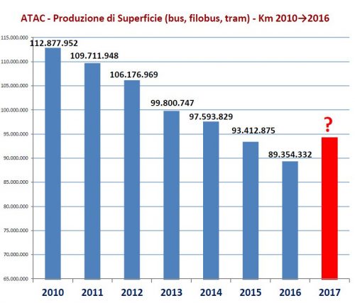Il fatto grave è che la produzione effettuata è nettamente inferiore a quella prevista dal contratto di servizio: 99.800.000 chilometri programmati, 87.128.141 effettuati.