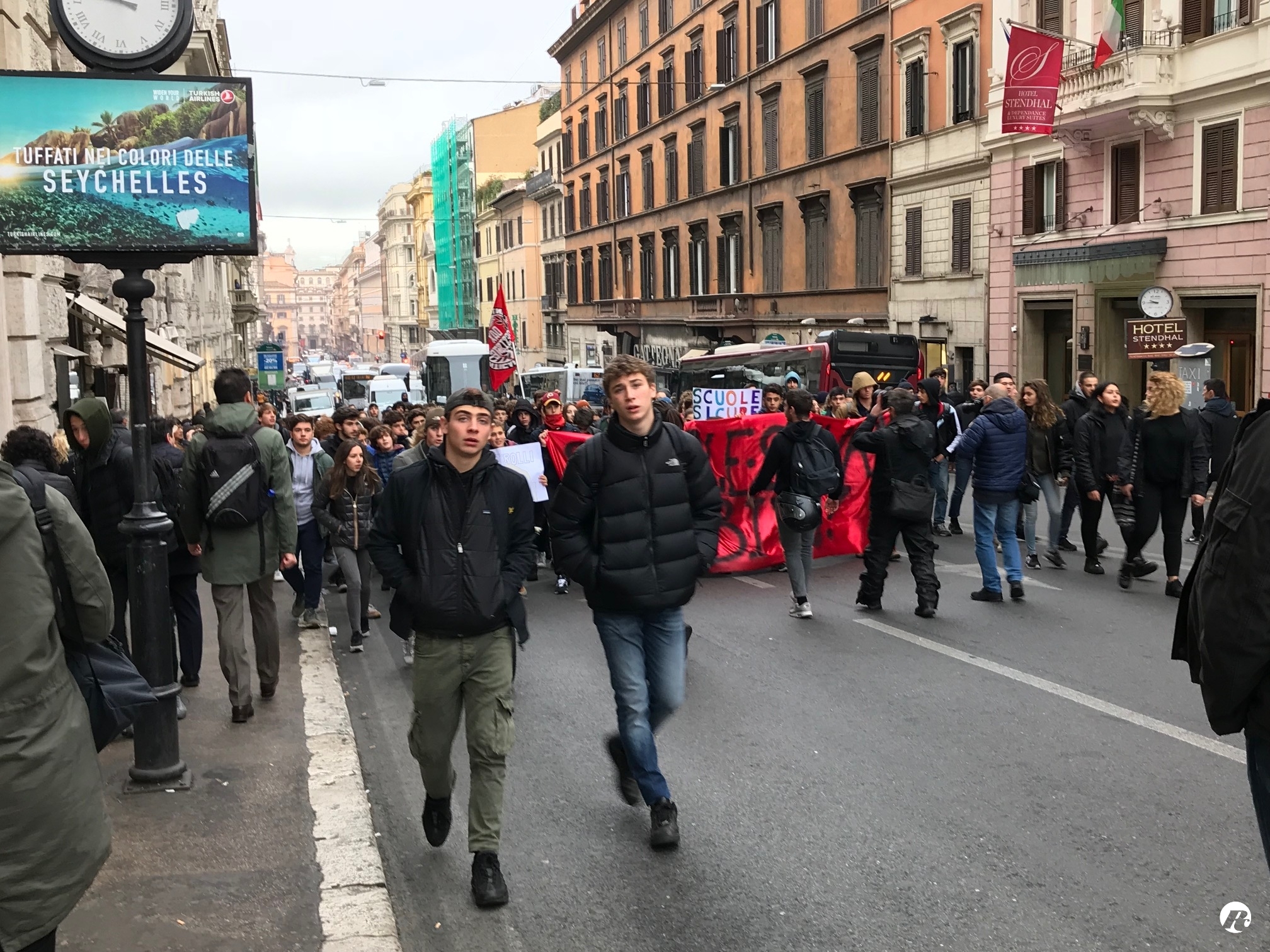 Poco dopo le 11 il corteo che ha sfilato davanti a Fontana di Trevi ha raggiunto piazza Santi Apostoli, qui i circa 200 manifestanti resteranno in sit-in in attesa di un incontro con la città metropolitana sul tema della sicurezza degli edifici scolastici.