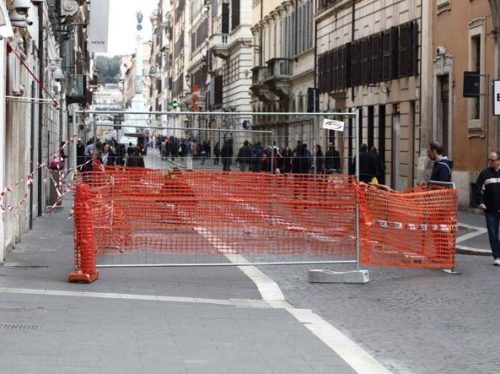 In via del Babuino, strada chiusa al traffico e marciapiedi transennati – chissà per quanto tempo – per il cedimento di parti di cornicione di un palazzo proprio sopra il negozio di Armani. Sotto accusa le infiltrazioni d’acqua, forse provocate dall’innaffiamento di alcune piante nei vasi appoggiati proprio sul cornicione. Il crollo, pur senza causare danni a cose o persone, ha fatto scattare la chiusura al traffico e ha fatto spuntare l’ennesimo «pollaio»: per delimitare un nuovo cantiere, con tanto di cartello «lavori in corso», che chissà quanto durerà.