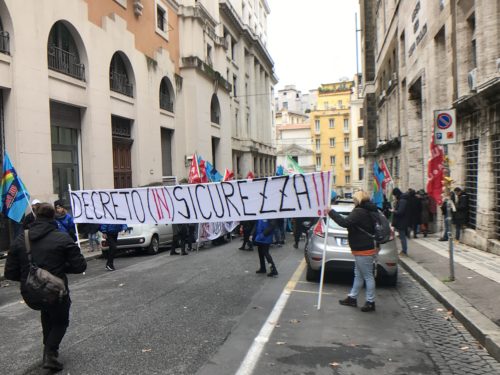 Sit-in dei lavoratori del Cara di Castelnuovo di Porto davanti al Mise a via Veneto . “107 tutti a casa. Prima gli italiani??” recita un grande striscione.