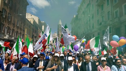 Inno di Mameli, tante bandiere italiane per una partecipazione ordinata ma decisa a far sentire le proprie ragioni. La forza pubblica – presente con camionette, cordoni e tenute antisommossa – stride con la diligenza di manifestanti che hanno espresso la propria contrarietà con palloncini e fumogeni.