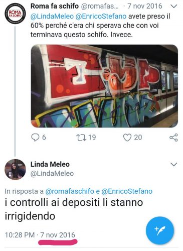 Altri utenti, come Mercurio Viaggiatore, hanno fatto notare la promessa social dell’assessora ai Trasporti di Roma Capitale Linda Meleo a seguito di una denuncia analoga fatta, sempre su Twitter, da Roma Fa Schifo: