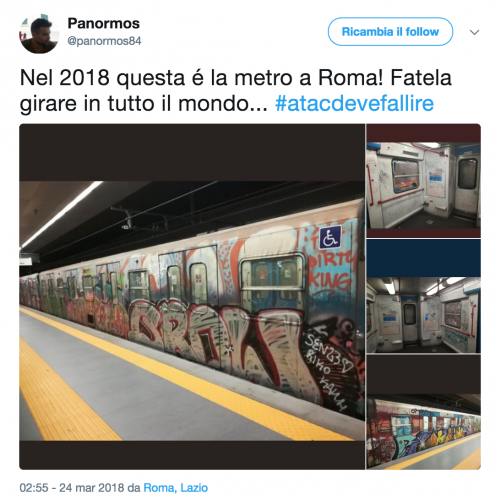 Su questo fronte la maglia nera spetta alla Metro B, da anni al centro di atti vandalici che deturpano i treni con scritte e disegni. Tra i tanti utenti di Twitter che hanno denunciato lo stato della metro che collega Rebibbia con Laurentina c’è Panormos, che ha pubblicato un book fotografico degli orrori con allegata una frase velenosa sul futuro del trasporto pubblico capitolino.