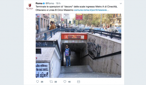 Ieri un tweet del profilo ufficiale di Roma Capitale ha annunciato la fine delle operazioni antidegrado sulle scale d’ingresso di tre fermate della metropolitana. Una notizia che avrebbe potuto far sorridere coloro che scendono alle stazioni di Cinecittà, Ottaviano e Circo Massimo: da ieri alcune opere dei vandali sono state pulite e igienizzate.