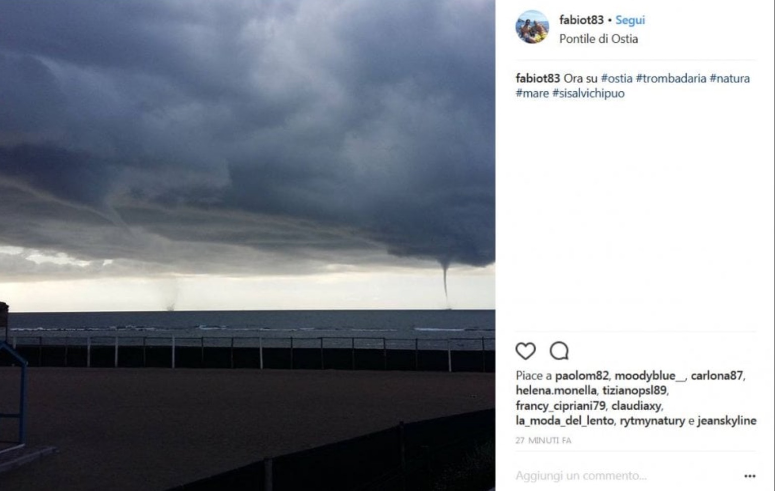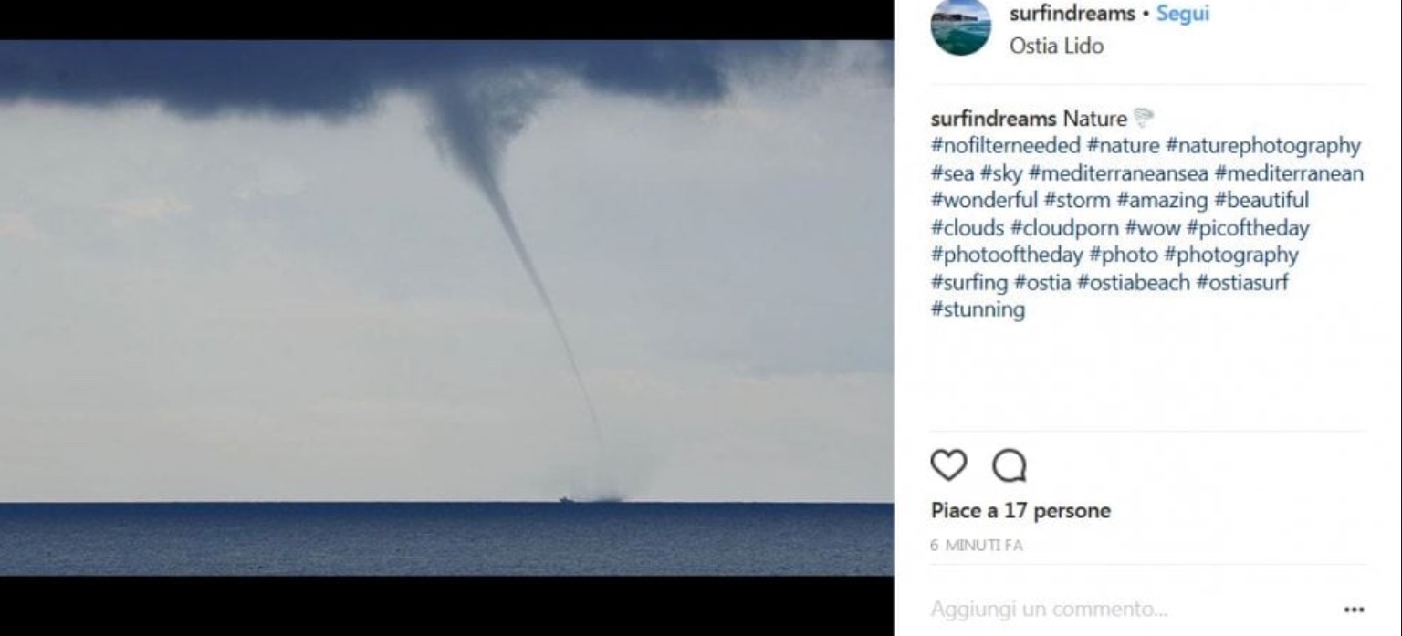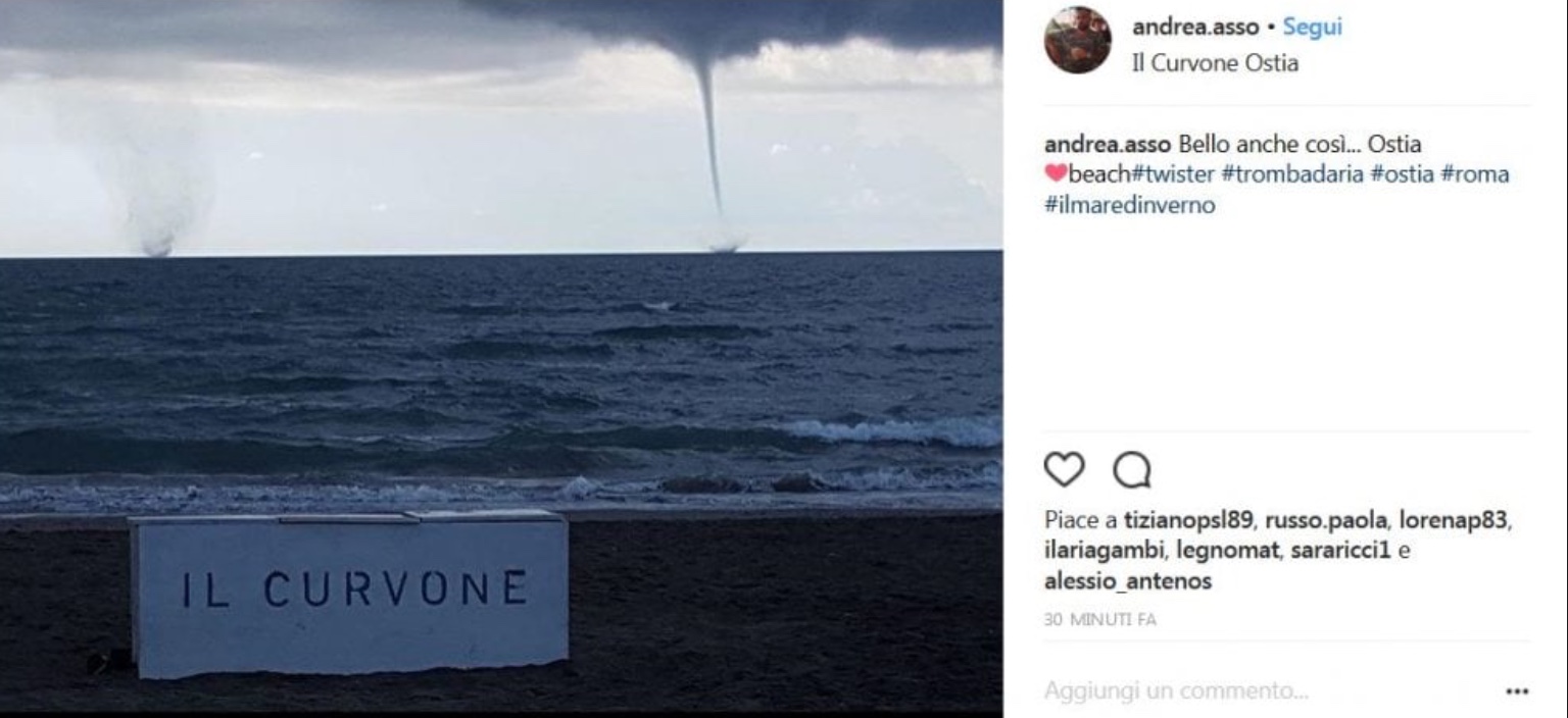 Al Porto turistico di Ostia, Lungomare Duca degli Abruzzo, si sono formate tre trombe d’aria che si sono poi spostate dal litorale. Il fenomeno dei vortici è stato visibile sulla costa tra Ostia, Fiumicino e Focene. Le trombe d’aria sono rimaste al largo senza avvicinarsi alla costa ma hanno continuato a richiamare l’attenzione di molti residenti. Non sono, infatti, mancate le foto scattate dai cittadini e dai curiosi che hanno iniziato a fare anche dei selfie. Ecco una selezione dei loro scatti postati sui social network.