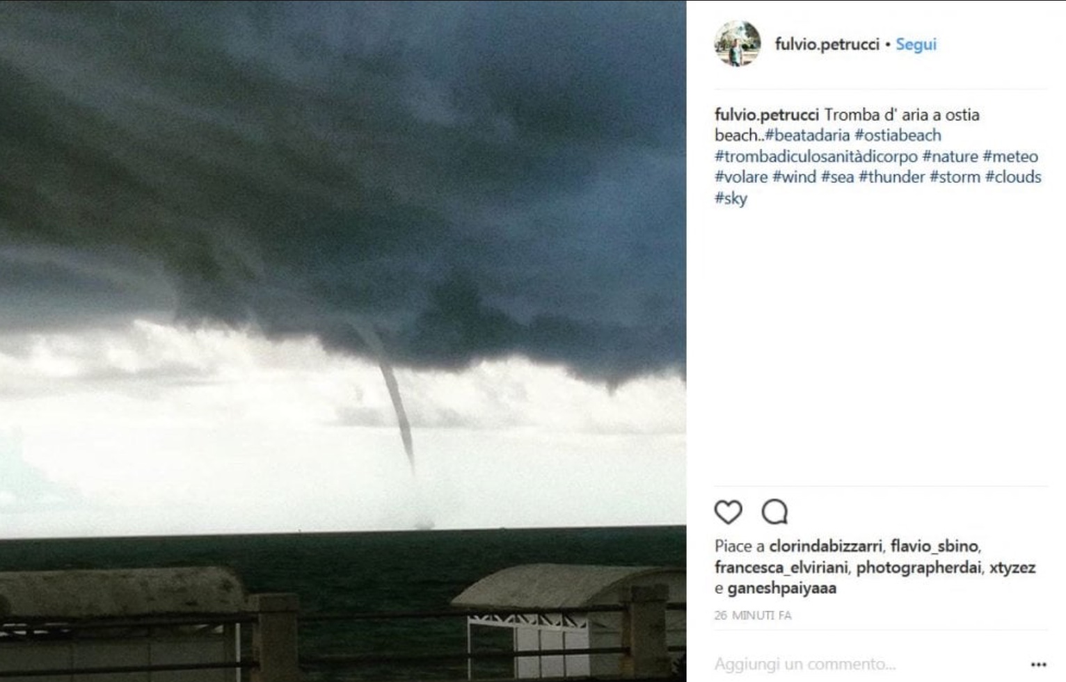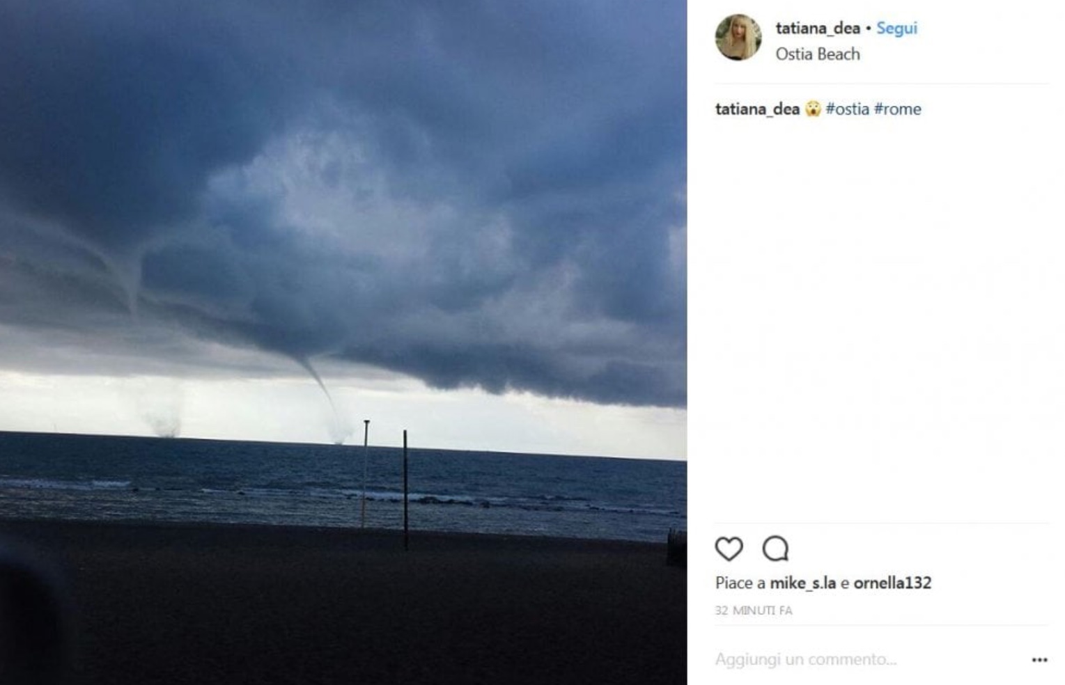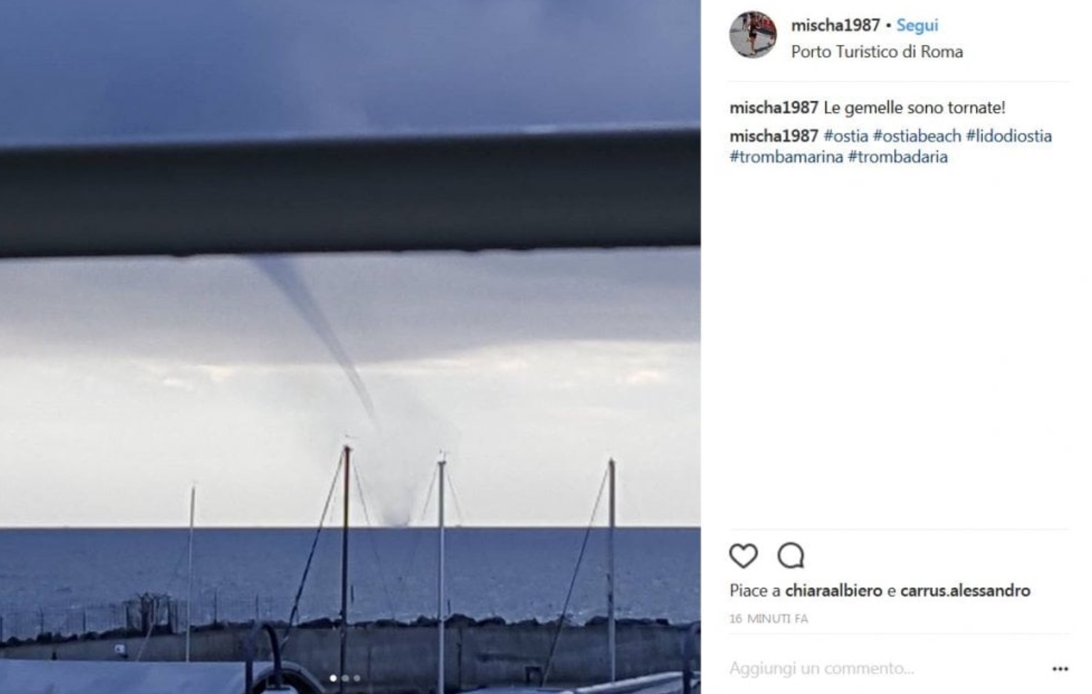 Al Porto turistico di Ostia, Lungomare Duca degli Abruzzo, si sono formate tre trombe d’aria che si sono poi spostate dal litorale. Il fenomeno dei vortici è stato visibile sulla costa tra Ostia, Fiumicino e Focene. Le trombe d’aria sono rimaste al largo senza avvicinarsi alla costa ma hanno continuato a richiamare l’attenzione di molti residenti. Non sono, infatti, mancate le foto scattate dai cittadini e dai curiosi che hanno iniziato a fare anche dei selfie. Ecco una selezione dei loro scatti postati sui social network.