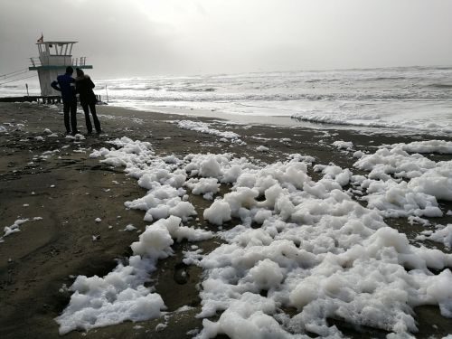 Cumuli di schiuma sono visibili da ieri sulle spiagge del litorale romano. La sostanza schiumosa bianca e leggera ha invaso gli arenili di Ostia e trasportata dal vento si è accumulata anche in diversi punti sul lungomare.