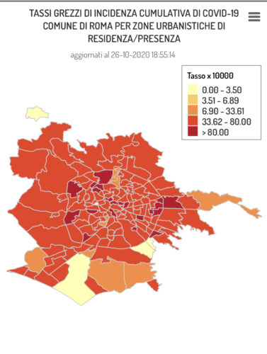 Crescono i contagi di Coronavirus nella Capitale, come mostra la mappa elaborata dal Seresmi (Servizio regionale per l’epidemiologia, sorveglianza e controllo delle malattie infettive ), aggiornata al 26 ottobre. Colpisce, in negativo, il dato relativo al quartiere Trieste che, come riposta oggi il dorso locale di Repubblica, in 21 giorni è passato da 155 a 291 positivi. In pratica, dai primi del mese i casi sono cresciuti dell’87,84%.