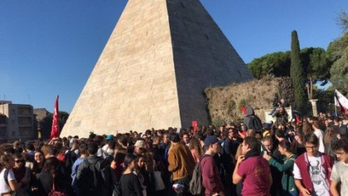 Sono scesi a migliaia a Piramide, dalle 8 di questa mattina, studenti da tutta Italia per protestare contro l’alternanza scuola-lavoro, uno dei punti principali della Buona Scuola, progetto però fallimentare secondo gli studenti, che al grido “Se ci tolgono il futuro, noi blocchiamo la città” chiuderanno il corteo con un sit-in direttamente sotto al Ministero. Intanto dall’Esquilino è partita anche la marcia di Blocco Studentesco, poi giunta al Colosseo.