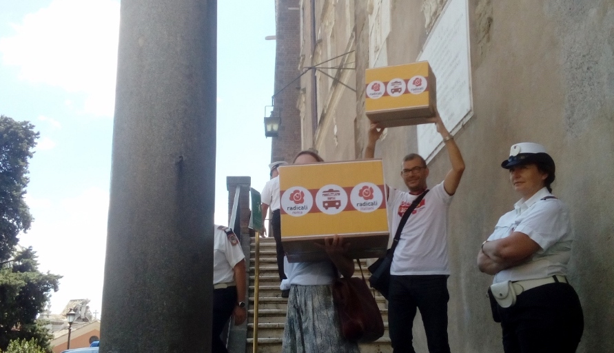 A bordo dei due minibus della campagna di comunicazione ‘Se non firmi t’ATtaCchi’, il segretario di Radicali Italiani Riccardo Magi e di Radicali Roma Alessandro Capriccioli, hanno depositato le firme in Campidoglio, presso gli uffici del segretariato generale, insieme ai militanti e ai volontari della campagna. “Siamo qua per la consegna di oltre 33 mila firme dei cittadini romani che hanno firmato negli ultimi 3 mesi il referendum ‘Mobilitiamo Roma’ promosso da Radicali Italiani e Radicali Roma. Ben più dell’1% che è necessario per fare indire un referendum. È una conquista non solo Radicale ma è una conquista popolare, democratica”, ha detto Magi. “Nei prossimi mesi, grazie a questo lavoro avremo un dibattito serio che affronterà uno dei punti centrali del governo della Capitale e non solo perché tutte le forze politiche saranno costrette a prendere una posizione, prosegue Magi. Questo è un referendum per l’efficienza dei servizi pubblici per il recupero da parte del Comune del suo ruolo, di pianificare il servizio e di controllare, conclude, che chi lo gestisce lo faccia bene”.