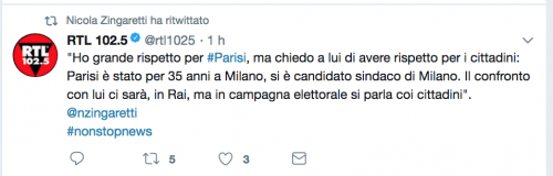 Zingaretti poi respinge al mittente la proposta di Parisi di un confronto pubblico: mi confronto con i cittadini, non con chi è più milanese che romano, è il senso del tweet dell’esponente dem. Un’ulteriore conferma che chi è in vantaggio, solitamente cerca di evitare possibili insidie sulla propria strada: